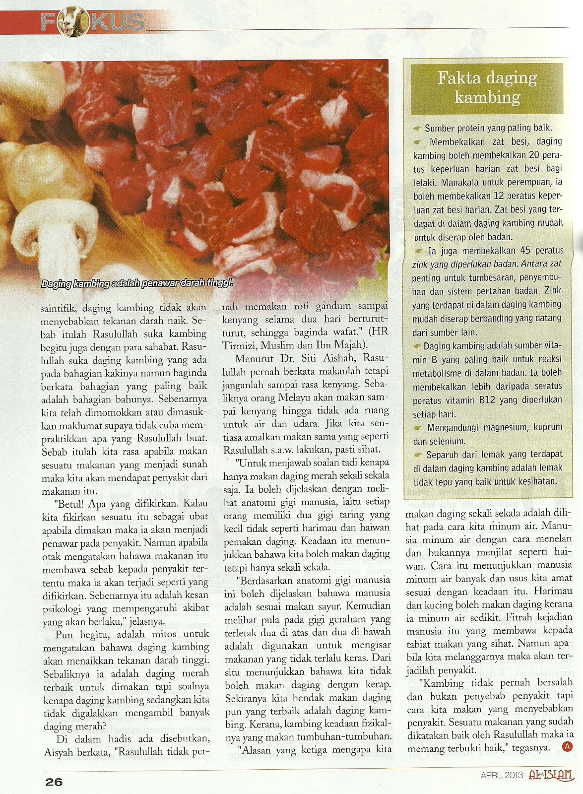 Sangat menarik rencana laporan khas majalah Al-Islam keluaran terbaru ini. Terapi Kambing. Menyentuh tentang keseluruhan aspek dan sejarah ringkas tentang kambing di zaman Rasulullah s.a.w. Begitu juga dengan ulasan saintifik tentang keberkatan daging kambing & susu kambing. Dan ulasan ketidakrasionalan taboo tentang kambing dalam masyarakat Melayu. Dapatkan segera di pasaran.